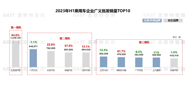 上半年,TOP10中自主品牌與合資/外資品牌各占5席,其中自主品牌占據(jù)TOP5中的4席。自主品牌中除長城外,均實(shí)現(xiàn)大幅增長;而合資/外資品牌中僅特斯拉實(shí)現(xiàn)同比正增長。從廠商排名來看,比亞迪穩(wěn)居第一梯隊(duì),上半年陸續(xù)推出10款冠軍版車型疊加騰勢(shì)品牌強(qiáng)勢(shì)崛起,在主流市場(chǎng)和中高端市場(chǎng)均取得巨大銷量突破。一汽大眾主要受燃油車影響,上半年銷量同比小幅下滑。奇瑞在國內(nèi)國外銷量雙增長的帶動(dòng)下,2023年以來穩(wěn)居第二梯隊(duì)。特斯拉Model Y/Model 3車型持續(xù)暢銷,上半年總銷量躋身第三梯隊(duì)位列第7位。上汽大眾/上汽通用、廣汽豐田等傳統(tǒng)合資車企受自主NEV產(chǎn)品沖擊,市場(chǎng)份額被進(jìn)一步擠壓。長城NEV銷量不及預(yù)期,是TOP10中唯一銷量同比下滑的自主車企。