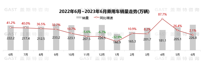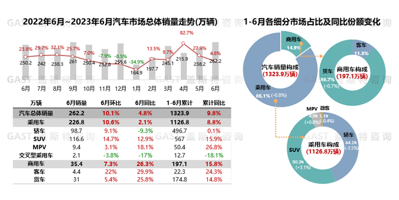 2023年6月,中國汽車市場(chǎng)銷售262.2萬輛,同比增長4.8%,環(huán)比增長10.1%;1-6月累計(jì)銷售1323.9萬輛,同比增長9.8%。近期中央與地方出臺(tái)一系列促消費(fèi)政策,疊加車企半年度促銷活動(dòng)及大量新車上市,市場(chǎng)需求逐步釋放,整體市場(chǎng)呈現(xiàn)持續(xù)回暖態(tài)勢(shì)。本報(bào)告圍繞2023年上半年中國車市銷量走勢(shì)進(jìn)行研究分析。