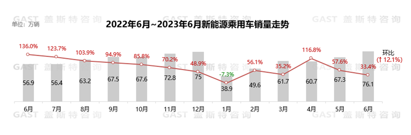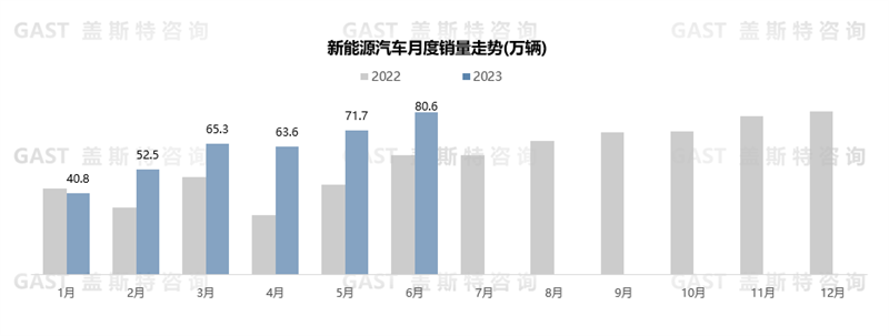 6月,新能源汽車共銷售80.6萬輛,同比增長35.2%,環(huán)比增長12.4%;上半年累計(jì)銷售374.5萬輛,同比增長44.1%。從滲透率來看,上半年全市場(chǎng)NEV滲透率達(dá)28.3%,乘用車市場(chǎng)滲透率達(dá)到31.4%。