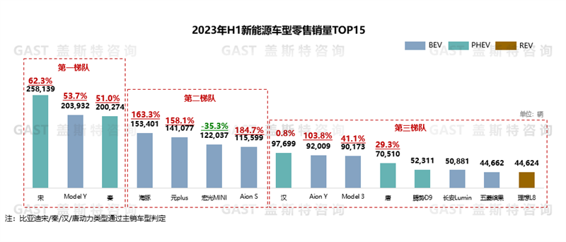 上半年,新能源乘用車銷量TOP15車型中,比亞迪(包括騰勢(shì)品牌)占據(jù)7個(gè)席位,且TOP5中除Model Y之外,均為比亞迪車型。自主新勢(shì)力中僅理想L8上榜,合資與豪華品牌車型無一上榜。具體來看,宋PLUS冠軍版和秦PLUS冠軍版拉動(dòng)宋/秦家族銷量進(jìn)一步增長,半年度銷量在20萬輛以上。Model Y年初降價(jià)后收獲大量訂單,上半年銷量突破20萬,排名上升至第二位。海豚上半年月均銷量突破2.5萬臺(tái),銷量超越宏光MINI,成為A0級(jí)及以下市場(chǎng)銷量第一。元plus/埃安S憑借性價(jià)比優(yōu)勢(shì),半年度銷量排名A級(jí)純電SUV和A級(jí)純電轎車第一。宏光MINI受到競(jìng)品增加(長安Lumin、五菱繽果等)影響,銷量同比下降近6萬臺(tái)。比亞迪漢/唐受到細(xì)分市場(chǎng)競(jìng)爭(zhēng)加劇影響,同比增幅弱于其他比亞迪車型。23款A(yù)ION Y對(duì)整車尺寸和智能配置方面進(jìn)一步升級(jí),同時(shí)拉低入門價(jià)格,銷量同比大增。