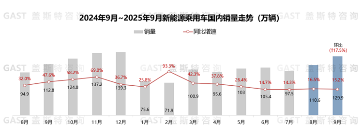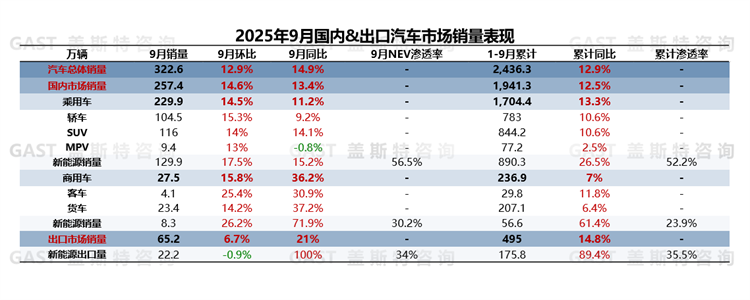 2025年9月,中國汽車市場銷售322.6萬輛,環(huán)比增長12.9%,同比增長14.9%。具體來看,一方面,以舊換新及地方促消費(fèi)政策有效激活購車需求;另一方面,車企季末沖量期間加碼車型優(yōu)惠,進(jìn)一步釋放消費(fèi)潛力;同時,新車型的持續(xù)投放也為銷量增長貢獻(xiàn)了穩(wěn)定增量,多重利好因素的共振效應(yīng)共同推動9月汽車市場呈現(xiàn)超預(yù)期增長。