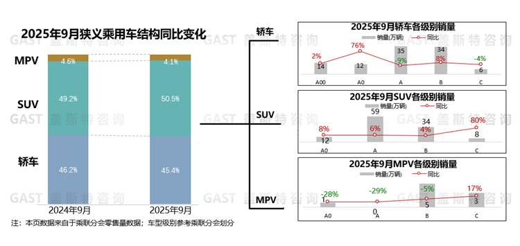 SUV份額為50.5%,同比增長1.3個百分點(diǎn)。主流市場同比小幅增長,A0級元UP同比增長超1萬輛;A級博越L銷量超2.8萬輛,創(chuàng)歷史新高,同時深藍(lán)S05等新款車型上市形成增量貢獻(xiàn)。B級市場穩(wěn)定增長,其中Model Y銷量超5萬輛,方程豹鈦7首月銷量超8千輛。C級及以上市場同比高增長,其中蔚來全新ES8及樂道L90增量顯著。