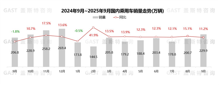 9月,國內(nèi)乘用車市場銷售229.9萬輛,環(huán)比增長14.5%,同比增長11.2%。政策方面,八部門發(fā)布《汽車行業(yè)穩(wěn)增長工作方案(2025—2026年)》,進(jìn)一步加大力度促進(jìn)汽車消費(fèi);供給方面,多數(shù)車企在九月初推出現(xiàn)金及金融權(quán)益;需求方面,各省以舊換新補(bǔ)貼發(fā)放節(jié)奏差異顯著,區(qū)域間的銷量增速持續(xù)分化。