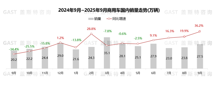 9月,商用車國內(nèi)銷售27.5萬輛,環(huán)比增長15.8%,同比增長36.2%。受去年同期基數(shù)較低及政策推動,國內(nèi)商用車市場連續(xù)四個月實(shí)現(xiàn)同比正增長。