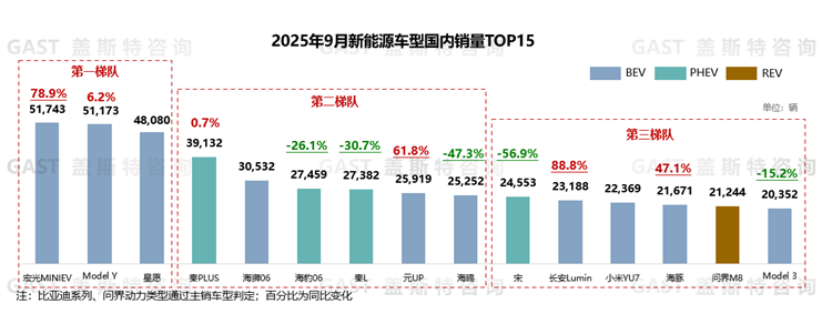 9月,比亞迪在TOP15中占據(jù)8席,仍保持?jǐn)鄬宇I(lǐng)先。具體來看,宏光MINI EV:月銷量超5萬輛,創(chuàng)單月歷史新高;Model Y:因季末集中交付,月銷量重返5萬輛以上;海獅06:銷量穩(wěn)定攀升,上市第二個完整月銷量超3萬輛,環(huán)比增長近20%;元UP:新版本開始上量,月銷量同環(huán)比增幅均超30%;長安Lumin:憑借價格優(yōu)勢銷量持續(xù)走高,9月銷量創(chuàng)歷史新高,同環(huán)比增幅均超50%;小米YU7:產(chǎn)能持續(xù)爬坡,累計訂單加速交付,月銷量環(huán)比實(shí)現(xiàn)超35%增長;問界M8:作為TOP15中唯一定價在40萬級的車型,連續(xù)四個月銷量突破2萬輛。