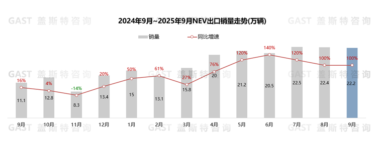 9月,汽車出口65.2萬輛,環(huán)比增長6.7%,同比增長21%。從動力類型看,ICE出口量恢復(fù)同比正增長;NEV出口量同比增長1倍,NEV滲透率達(dá)34.1%。