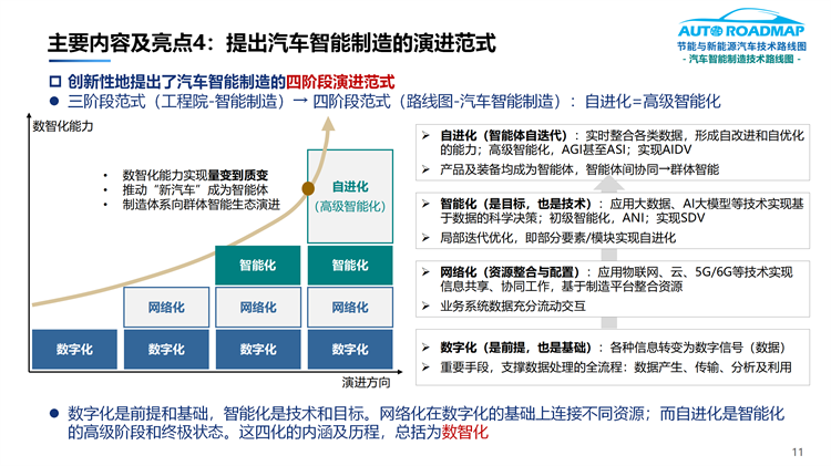 4.提出了汽車(chē)智能制造的四階段演進(jìn)范式:即數(shù)字化→網(wǎng)絡(luò)化→智能化→自進(jìn)化