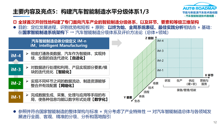 5.全球首次開(kāi)創(chuàng)性地構(gòu)建了專(zhuān)門(mén)面向汽車(chē)產(chǎn)業(yè)的智能制造分級(jí)體系(iM-n),以及環(huán)節(jié)、要素和等級(jí)三維架構(gòu)